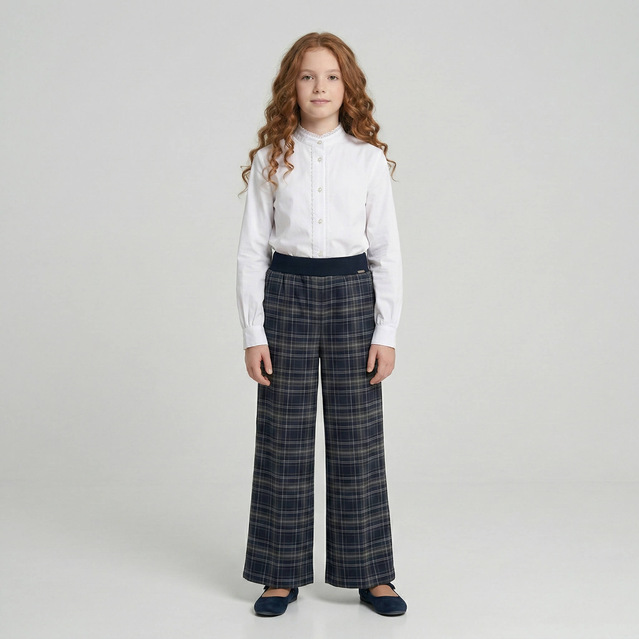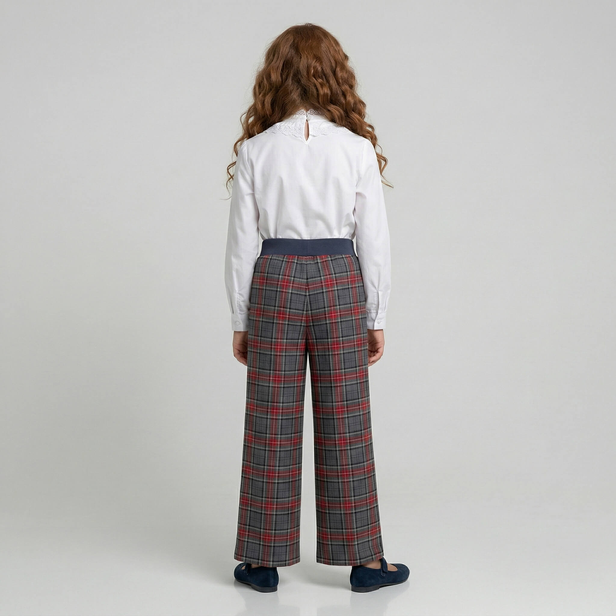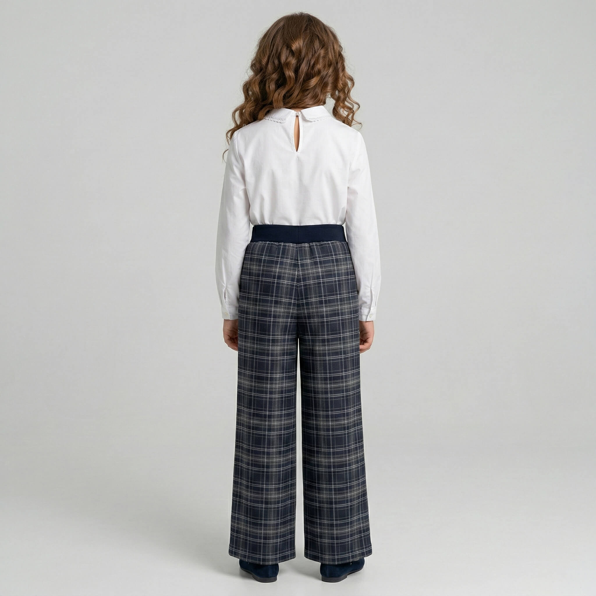Модель выпускается как в строгих базовых тонах, так и в стильных клетчатых паттернах, которые делают брюки главным акцентом школьного образа: