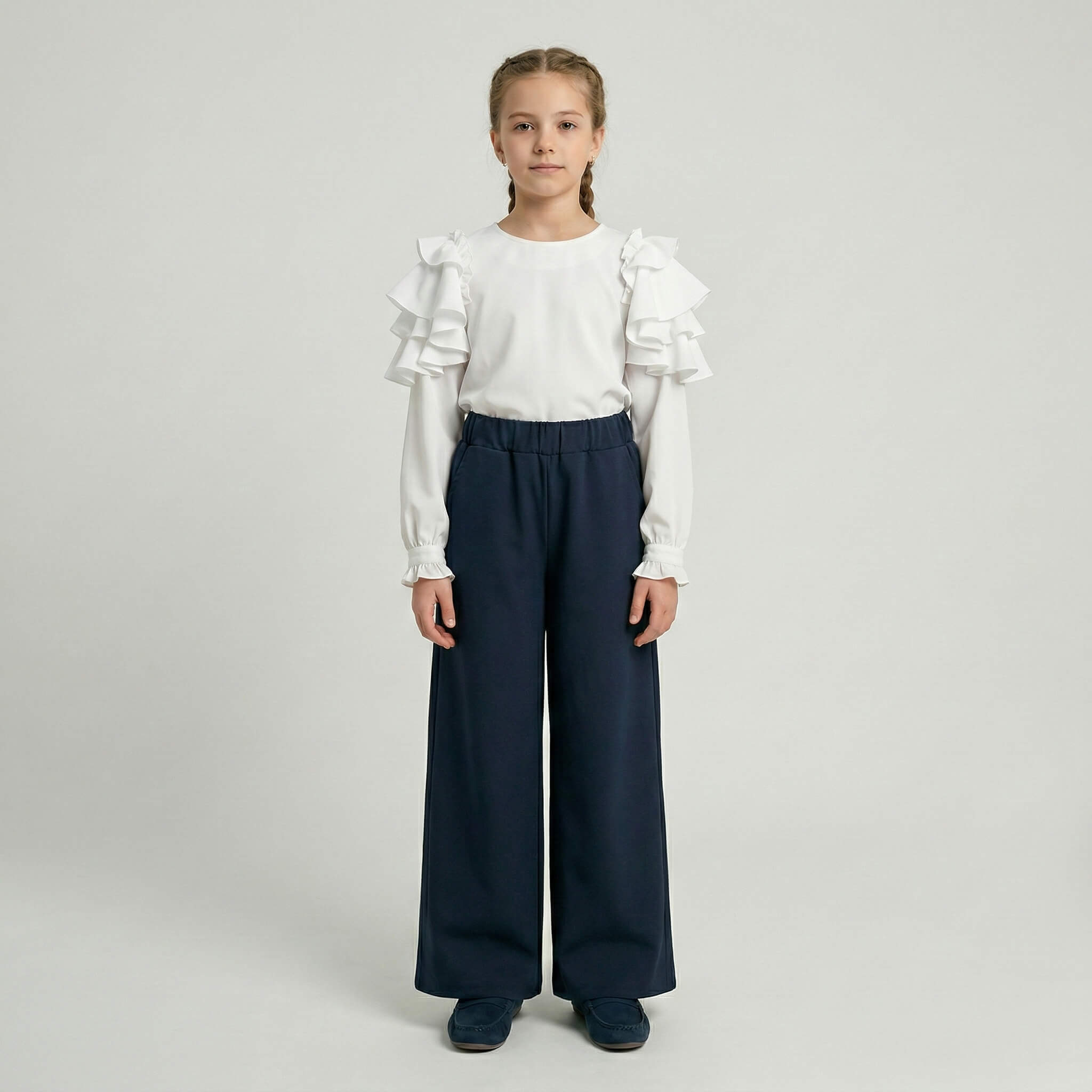 Главное преимущество этой модели — максимальное удобство. Брюки имеют свободный, расширяющийся от бедра крой, который абсолютно не сковывает движений. Вместо сложных застежек и пуговиц предусмотрен широкий контрастный пояс на мягкой резинке. Он обеспечивает комфортную и надежную посадку на талии, не давит на живот и позволяет девочке легко и быстро переодеваться на физкультуру.