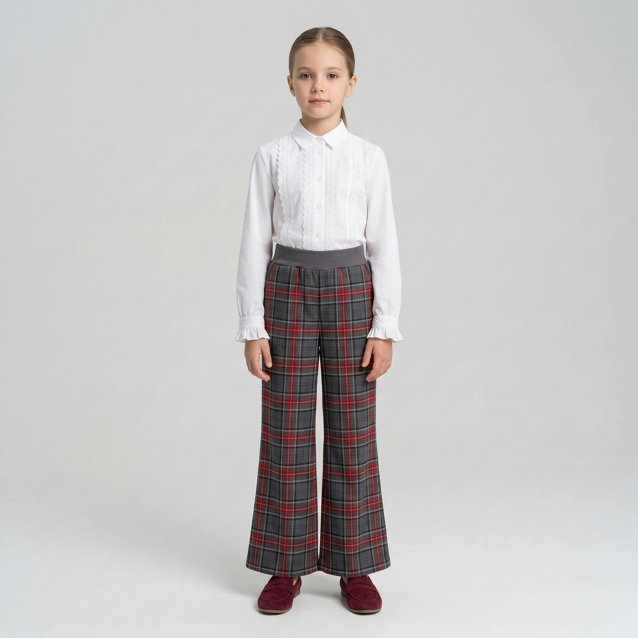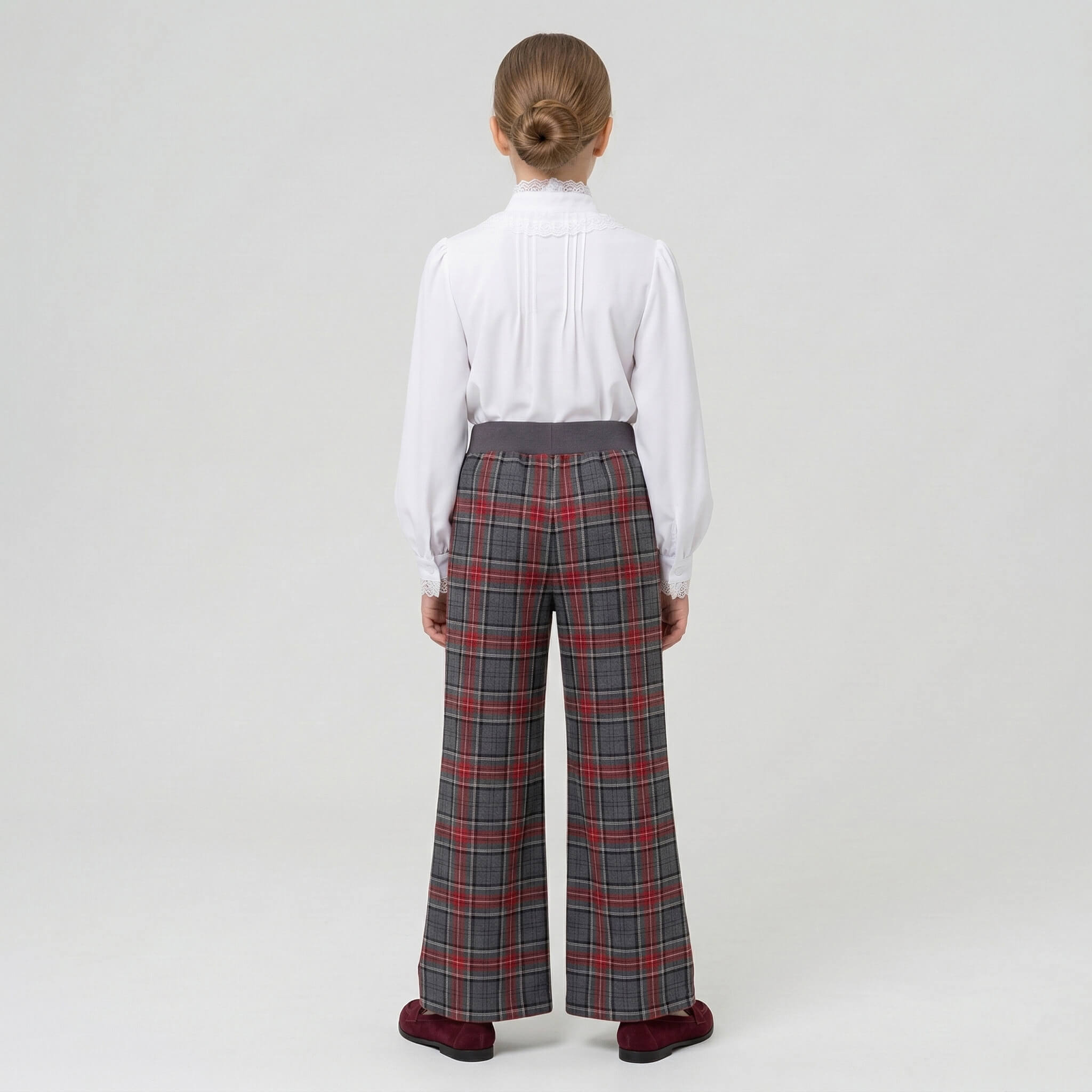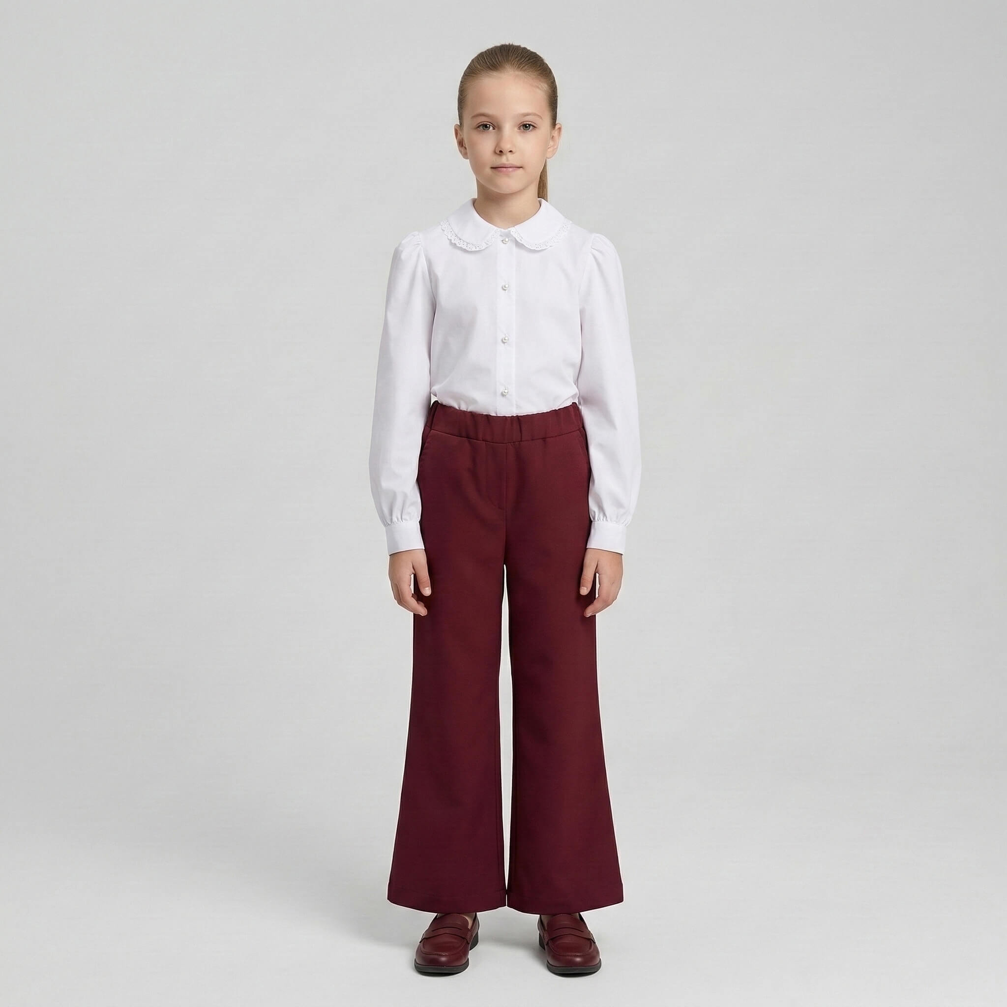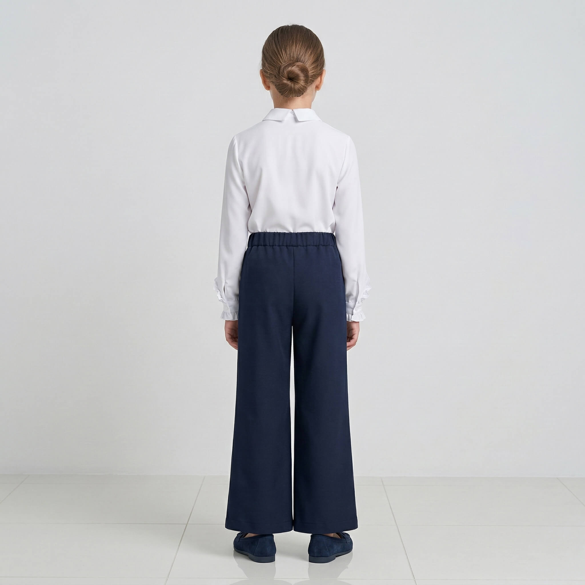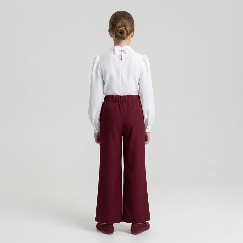 Главная изюминка этой модели кроется в конструкции пояса. Спереди он выполнен абсолютно гладким, создавая строгий и аккуратный внешний вид, который идеально сочетается с заправленными блузками. На спинке же предусмотрена эластичная резинка (сборка). Благодаря этому брюки превосходно садятся на любую фигуру, не сдавливают живот при длительном сидении за партой и обеспечивают максимальный комфорт. Широкий прямой крой от бедра дарит абсолютную свободу движений.