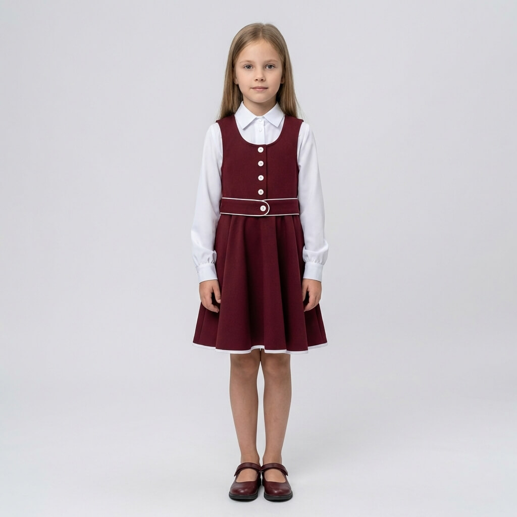 Школьный сарафан А-1101а от фабрики «Евролэнд» — это нарядная классика, которая превращает школьную форму в любимый элемент гардероба. Благодаря контрастным деталям модель выглядит торжественно и опрятно, идеально подходя как для праздничных линеек, так и для учебных будней.