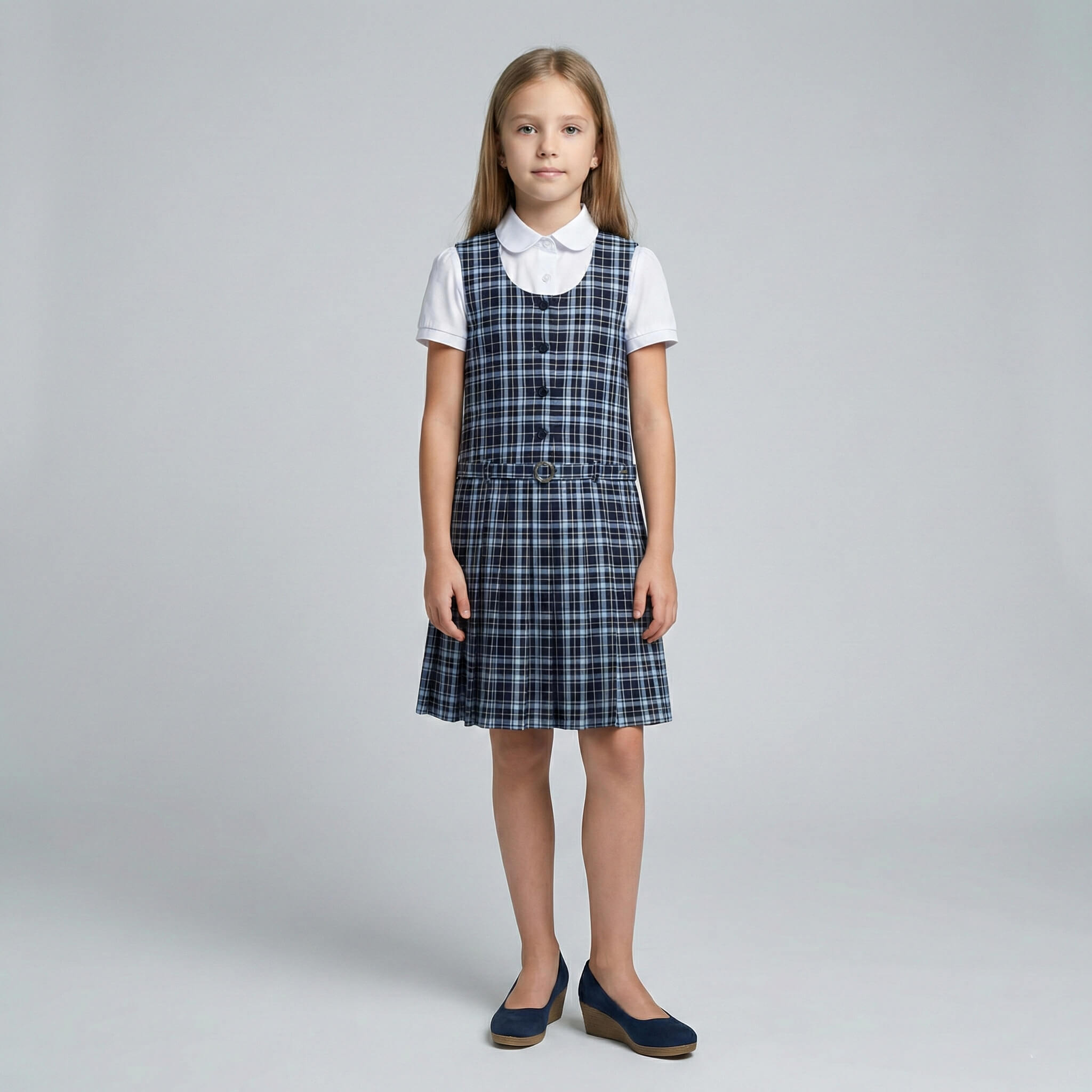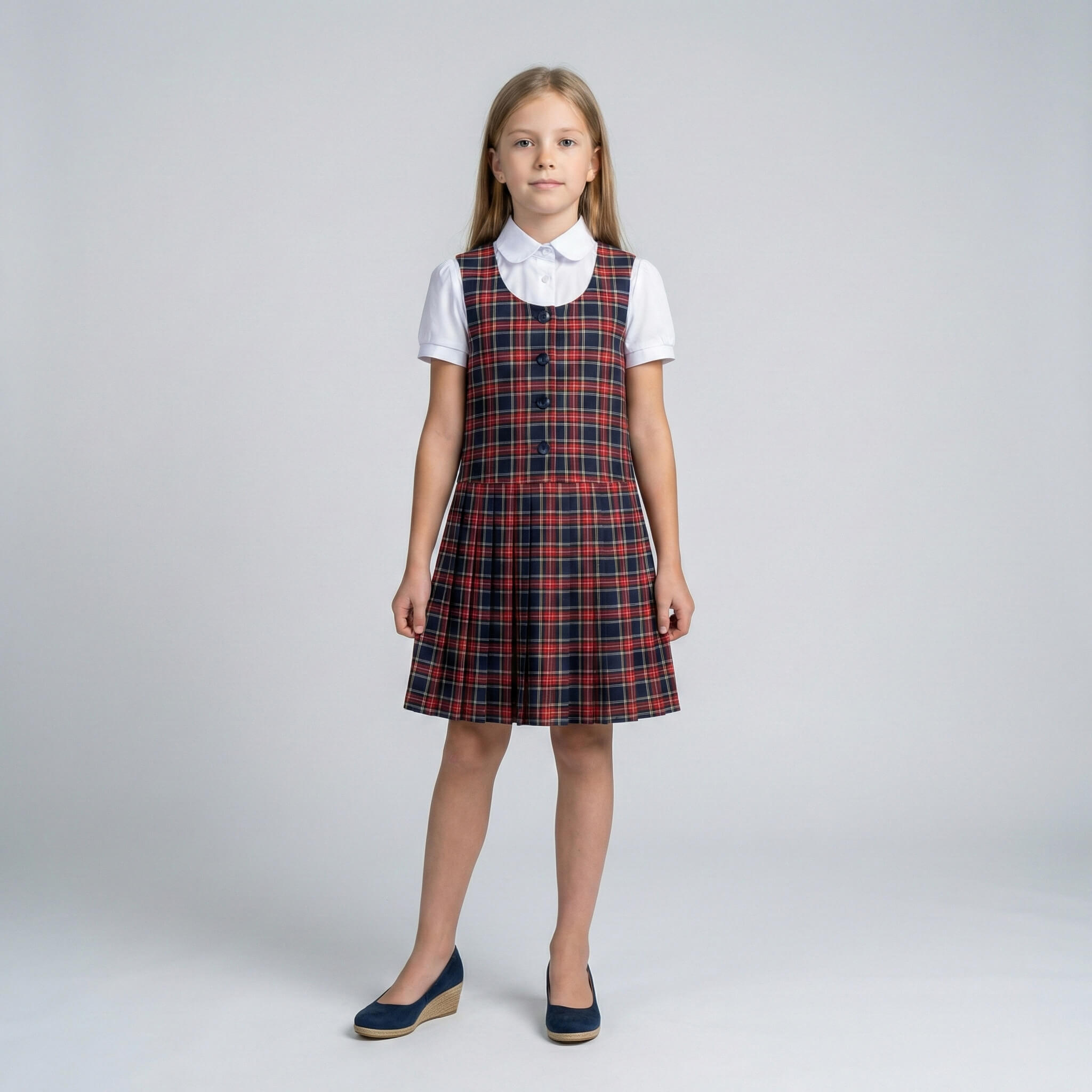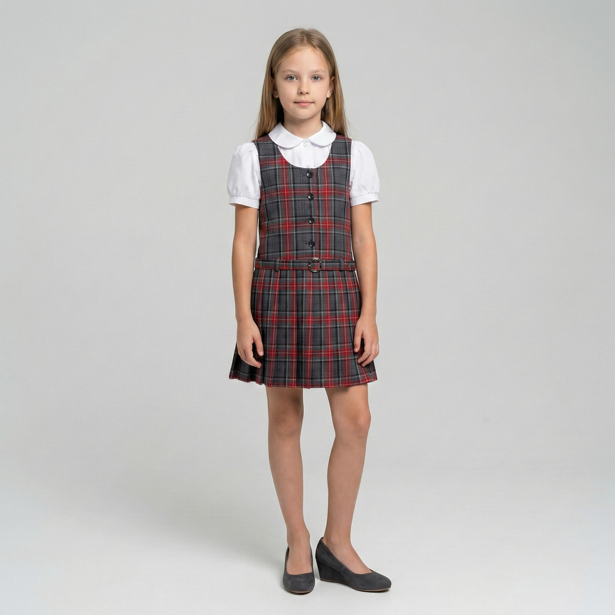 Сарафан имеет удобную застежку на пуговицы спереди, что позволяет ребенку легко и быстро переодеваться самостоятельно. Аккуратный нагрудный карман (на моделях в клетку) добавляет стильный акцент, а плиссированная юбка создает красивый силуэт и не сковывает движений.