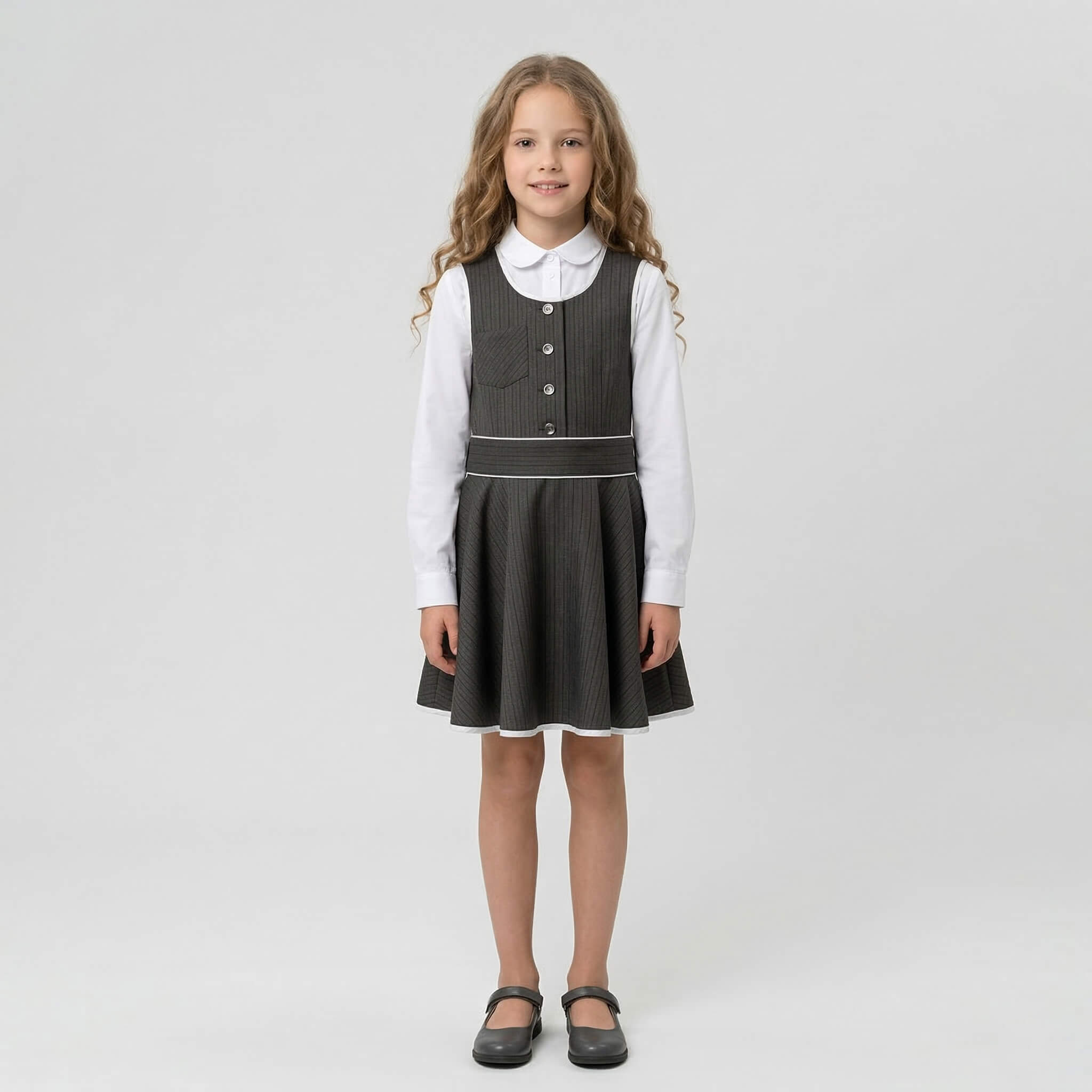 - Безупречная форма: плотный материал превосходно держит форму расклешенной юбки и практически не мнется после долгого сидения за партой.